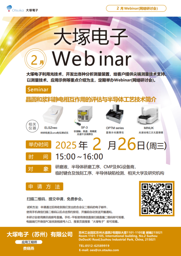大塚電子的 Zeta 電位測量系統“ELSZ 系列”不僅可以測量溶液中膠體粒子的 Zeta 電位,也可以測量平板狀、薄膜狀樣品的 Zeta 電位。通過這樣的測量可以評價平板狀樣品的表面改質狀態以及液體中粒子的吸著特性。本次研討會將介紹其應用。